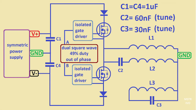 To be able to create a free energy generator based on the above circuit diagram, an additional inverter is required to convert the output voltage and high frequency. And it is possible to design a feedback circuit that feeds the square pulse generator and feedback to the "summetric power supply" in the diagram above.